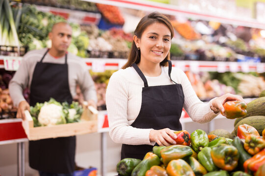 Latin saleswoman in black apron and her assistant with box of vegetables in background