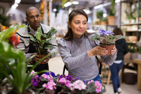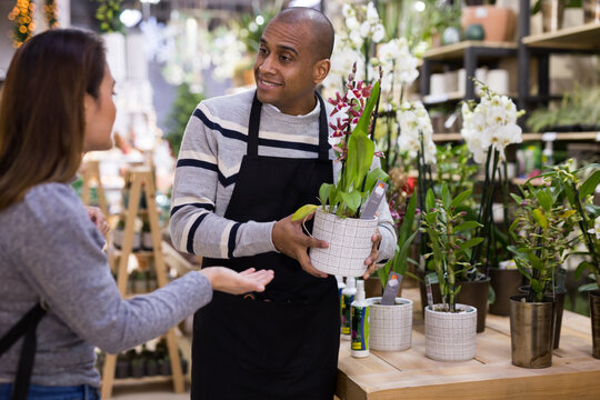 Seller helping woman to choose orchids flowers in flower shop