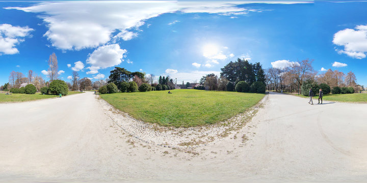 3D spherical panorama with 360 viewing angle. Ready for virtual reality or VR. Full equirectangular projection. Cold blue sky with green grass and with some trees at summer.