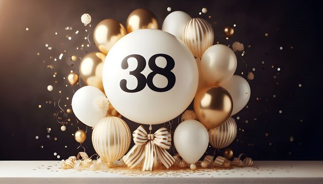 38th Balloon number 38 for birthday anniversary party gold foil balloon greeting with cute cake background.