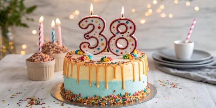 38th birthday cake celebrating 38 years on an isolated, colorful pastel background.