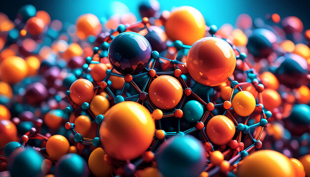 Colorful 3D atoms artwork. Pharmaceutical or biochemical abstract AI generated art.