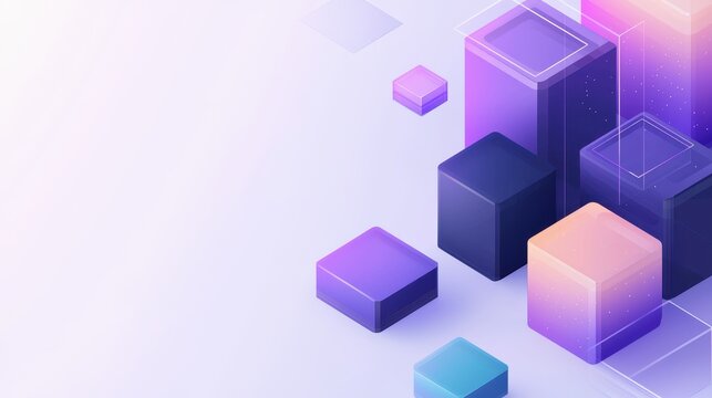 A modern digital design featuring 3D geometric shapes in vibrant purple and blue hues against a light background.