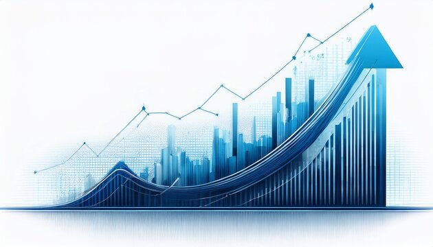 A blue bar graph with an upward trending line and arrows on a white background showing growth