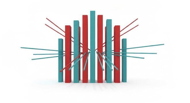 Abstract arrangement of red & blue bars linked by lines, on white background