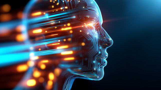 Futuristic digital human head with glowing circuits and light trails symbolizing artificial intelligence and technology.