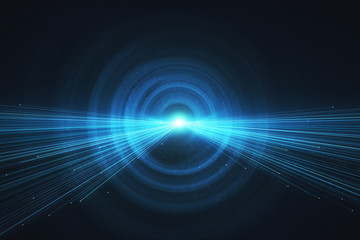 Hyperspace tunnel, radiating energy and light. Bright stars illuminate the blue explosion. Futuristic concept