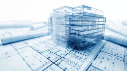 Architectural Blueprint with 3D Modern Building Model on Technical Drawings