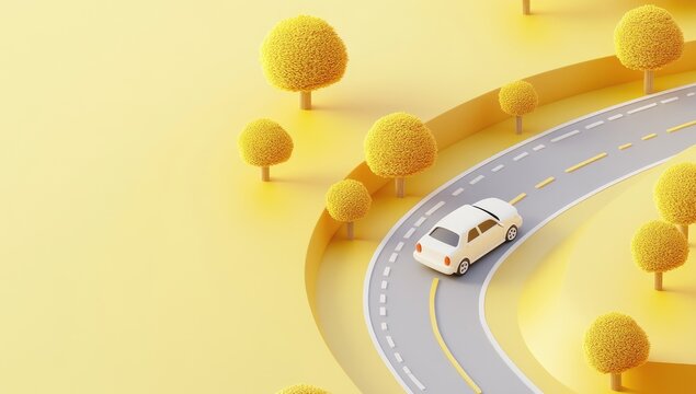 Minimalist, 3D rendered scene of a winding road with a small white car and yellow trees
