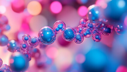 Pink, blue spheres; abstract DNA; bokeh background; science