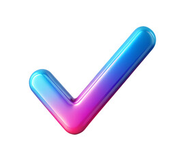A 3D glossy gradient checkmark symbol within a circular badge, with holographic blue and pink hues and a glass-like reflective texture. Isolated on a transparent or white background.