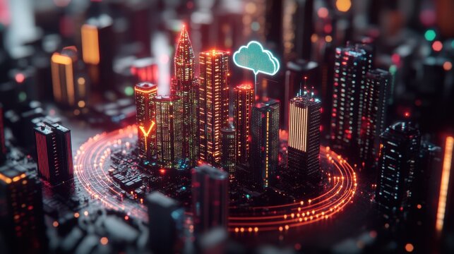 A stylized digital cityscape illuminated in vibrant red and orange lights encircled by glowing data streams and topped with a cloud computing icon