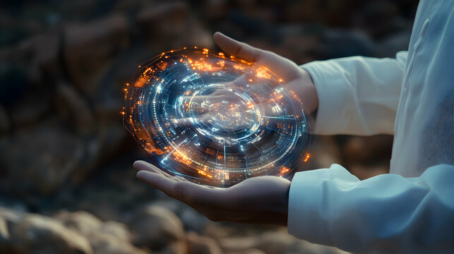Futuristic Hands Holding Digital Hologram with Orange and Blue Lights