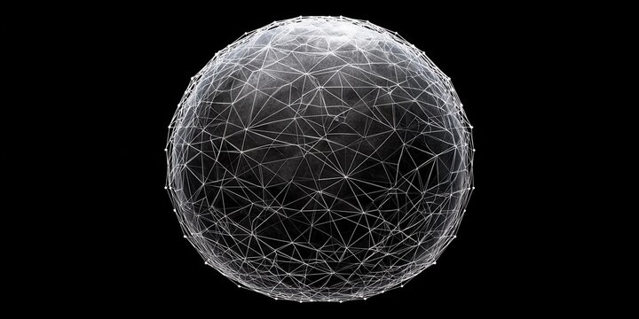 A spherical structure with interconnected lines, resembling a network or digital globe, set against a black background.