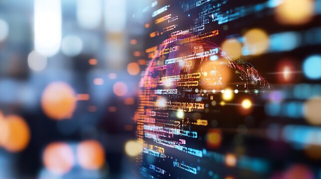Abstract digital visualization showcasing a 3D globe with glowing data lines and vibrant colored bokeh lights : Generative AI
