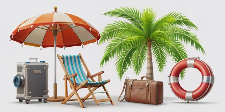 Set of resort elements in 3d realistic style beach chair, suitcase, camera, umbrella, palm tree, lifebuoy.  illustration