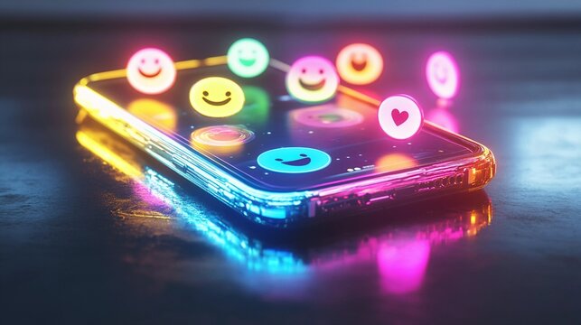 A smartphone placed on a sleek, reflective surface, glowing softly with neon emojis floating above it in vibrant colors. Suitable for marketing or business purposes