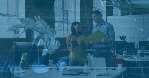 Walking colleagues discussing data with folders in modern open-plan office with neon chart overlay
