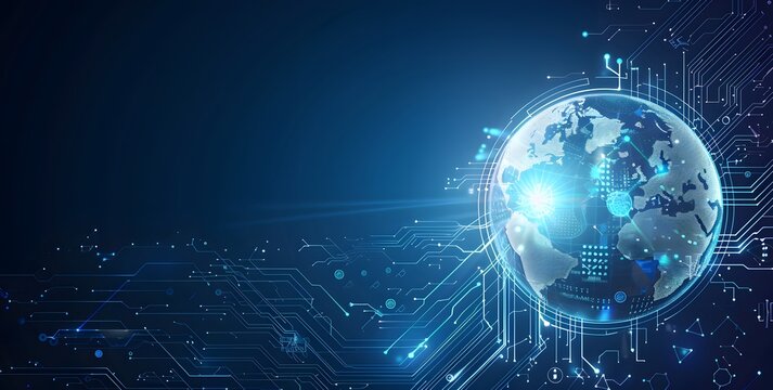 A stunning, digitally rendered image of the Earth as a glowing blue globe, positioned centrally on a sleek, dark