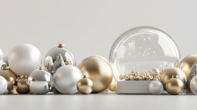 3. **Festive Ornament Display**: Design a stunning 3D render featuring an assortment of white and gold Christmas baubles, with an empty glass snow globe prominently displayed. The scene should