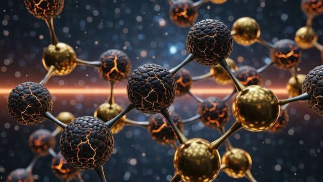 3d abstract molecular structure with gold and dark spheres glowing orange in space