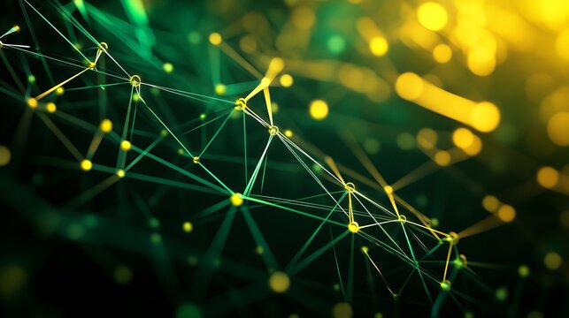 Futuristic high tech 3d render with green and yellow background and interconnected network lines illustrating connectivity concept