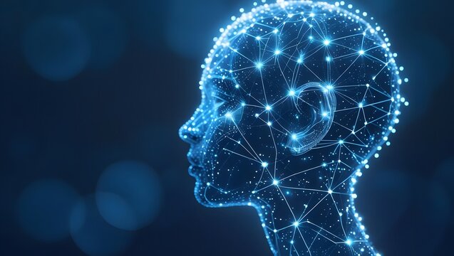 Futuristic digital artwork of an abstract human head glowing in blue mesh lines, a constellation-like network with a bokeh effect, symbolizing artificial intelligence connectivity.