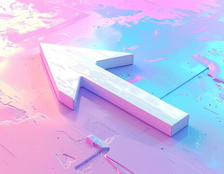 Displaying 3D metallic arrow tilting upward right in gradient studio, with blue purple teal steps