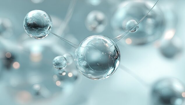 Abstract rendering of interconnected translucent spheres, resembling a molecular structure or network, in soft teal hues against a blurred background