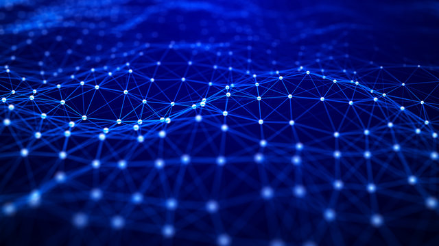 Glowing blue digital network point cloud linking nodes with thin lines and mesh background
