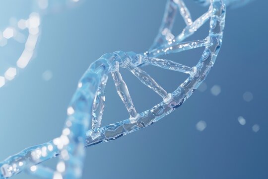 A closeup of a crystalline DNA strand glowing against a blue background