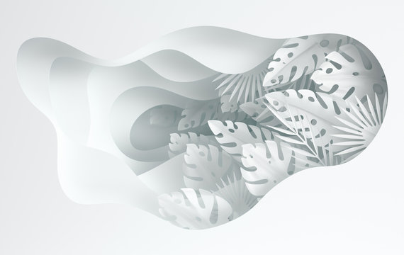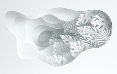 Tropical paper palm leaves frame. Summer tropical white leaf and paper hole layers. Origami exotic hawaiian jungle foliage, summertime background. Paper cut. Minimal style. 3d render