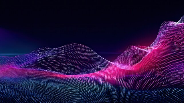 Abstract Glowing Landscape With Blue and Pink Dotted Waves On Dark Blue Background Representing Digital Data Visualization and Futuristic Technology