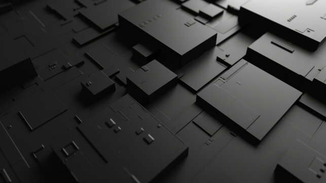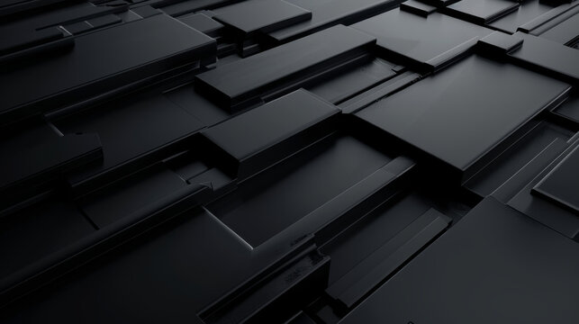 Black tech background, with a geometric 3D structure. Clean, minimal design with simple futuristic forms. 3D render