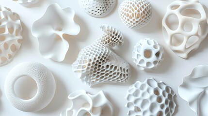 A collection of white, 3D printed objects on a white background.
