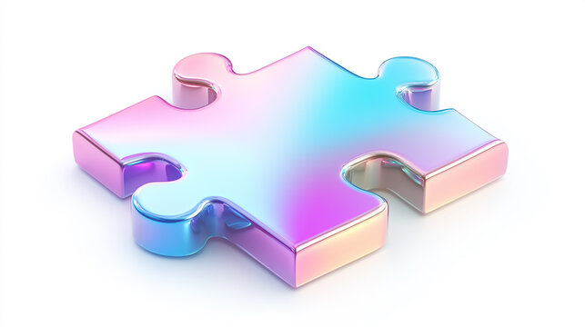 A 3D glossy gradient puzzle piece icon, with smooth, rounded edges and an iridescent holographic blend of pink, blue, and purple hues. Isolated on a white background.