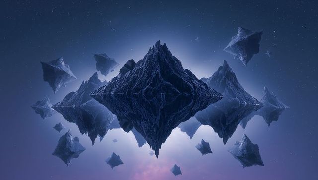 Floating inverted pyramid rock formations drifting through cosmic starfield and nebula