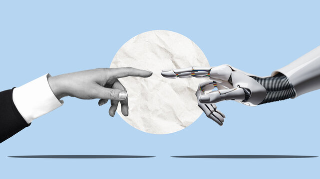 White cyborg robotic hand pointing his finger to human hand with stretched finger - cyber la creation - flat art collage.