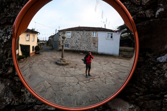 Photographer shooting a self portrait in a road cross mirror, Spain