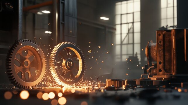 Photorealistic 3d render of a gear and cog in dramatic light with intricate industrial design