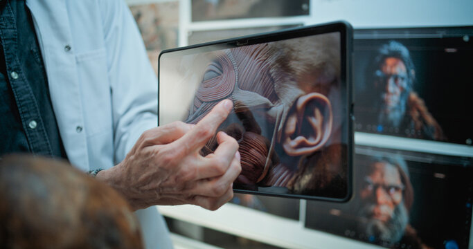 Archaeologists study anatomy of fossil skull using tablet computer with 3D visualization of ancient human head, work in archaeological lab. Board with printed images of Neanderthals in the background.