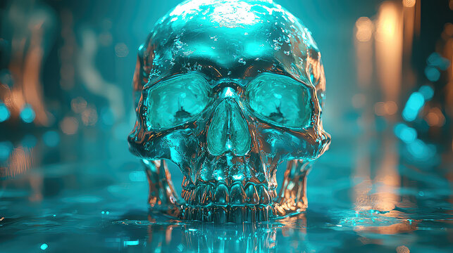 Glowing metallic skull reflected in teal liquid, dark background.