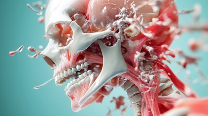 An intricately designed 3D anatomy model showcasing the human skull and associated muscles, providing a stunning view of biological structure and artistic representation.