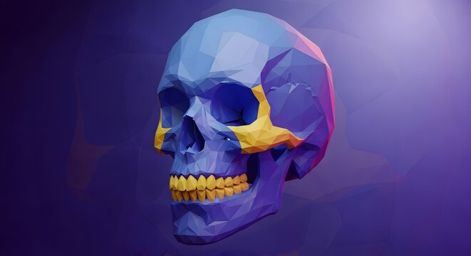 Low-poly 3D model of a human skull, blue and yellow.