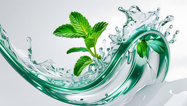 Dynamic 3D Water Splash with Fresh Mint Leaves