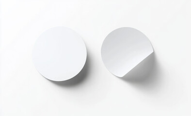 Blank white round adhesive stickers mock up with curved corner, 3d rendering. Empty circle sticky label mockup with curl. Clear adherent tag template for glass door or wall.