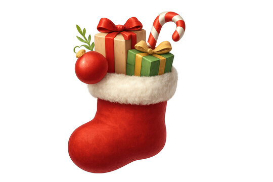Red christmas stocking filled with presents and candy cane
