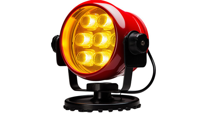 Bright red LED spotlight with powerful illumination isolated on transparent background