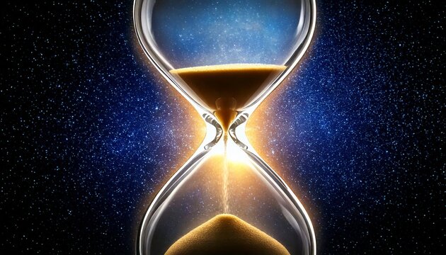 Glowing sand moves in reverse through an hourglass, suspended in a cosmic dance. A visual metaphor for the fluidity of time, set against an expansive starry sky