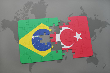 puzzle with the national flag of luxembourg and turkey on a world map background.